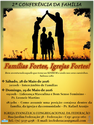 Neste final de semana concluiremos a programação do mês alusiva a família. No sábado, 28/05, às 20h00, teremos o primeiro Intercâmbio de Famílias. No domingo, 29/05, às 09h00, receberemos o Rev. Leoneir Neves Martins, pastor da Igreja Congregacional de Salvador. Seu tema será: Liderança masculina e bom senso feminino, e às 18h30, ministrarei sobre o tema: Como assumir uma posição corajosa dentro da igreja, da família e da comunidade.